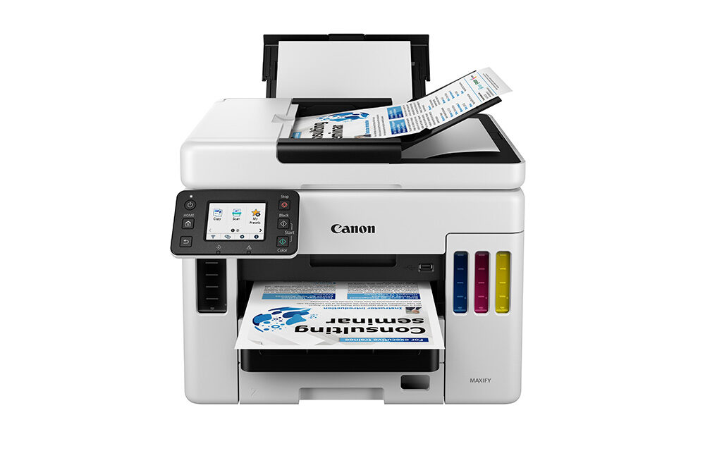 Referência em soluções de impressão corporativa. Baixo custo de impressão com enorme rendimento, imprime até 21.000 páginas com as garrafas de tinta colorida ou 9.000 páginas com a garrafa de tinta preta no modo Econômico. Conte sempre com impressões de qualidade, mesmo no modo Econômico. Impressão de alta velocidade de até 45 páginas por minuto em preto e branco e 25 páginas por minuto em cores, assim você terá a velocidade que seu negócio exige. Fácil manutenção com a cabeça de impressão e o cartucho de manutenção que, se necessário, são facilmente substituídos pelo próprio usuário no conforto de seu escritório. Imprima, digitalize, copie e conecte-se à nuvem por meio do aplicativo Canon PRINT. Compatível com Apple AirPrint (iOS) e Mopria (Android), conecte via cabo ethernet ou sem cabo via dual-band Wi-Fi.